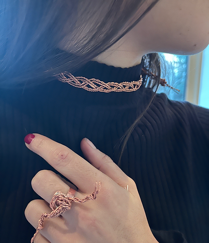 Cada pieza representa un gesto de unión: los hilos de cobre se entrelazan imitando la estructura de los nudos, aludiendo a lazos familiares que se transmiten a lo largo de generaciones. El material escogido, cobre en diferentes grosores, refuerza esta idea por su resistencia y su cualidad cálida, conectando también con el entorno natural y marítimo.